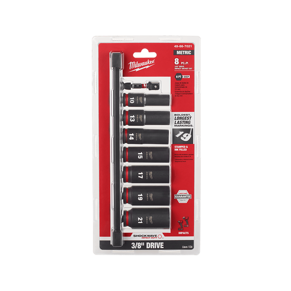 The MILWAUKEE® 8 Piece SHOCKWAVE Impact Duty™ 3/8" Drive Deep Socket Set features the boldest, longest-lasting markings and extreme impact durability in high torque applications. The stamped and ink-filled size markings make it easy to select the right socket every time throughout the life of the socket. Engineered with high strength forged steel for optimised performance in heavy-duty applications, and a non-slip hex geometry prevents fastener rounding. The dual-hole design and ring groove allow for easy socket attachment and removal. All SHOCKWAVE Impact Duty™ Sockets are backed by a Lifetime Guarantee and meet ASME industry standards.