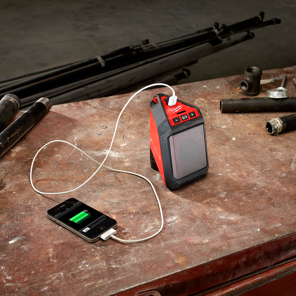 Jobsite durability with rugged overmold and metal speaker grill to withstand drops, water and debris.