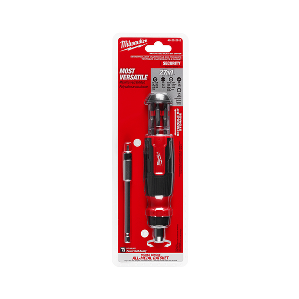 Our 27-in-1 Ratcheting Security Multi-Bit Screwdriver is the most versatile multi-bit screwdriver in the range. This tamper proof multi-bit screwdriver features easy-access in-handle storage, which keeps bits organized and allows you to quickly change bit sizes and types. The durable, all-metal ratchet provides higher torque and faster driving. The removable bit holder has a 1/4" hex shank, making it power tool ready for maximum jobsite versatility. The chrome-plated bit holder provides rust protection and reduces wear from elements on the jobsite. The Milwaukee® 27-in-1 Ratcheting Security Multi-Bit Screwdriver includes : T7, T8, T10, T15, T20, T25, T27, T30, T40, SP4, SP6, SP8, SP10, 3/32", 7/64", 1/8", 9/64", 5/32" (4mm), 3/16", 2mm, 2.5mm, 3mm, 5mm, TS6, TS8, TS10, 1/4" Nut Driver and is backed by our Limited Lifetime Warranty.