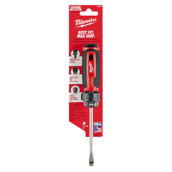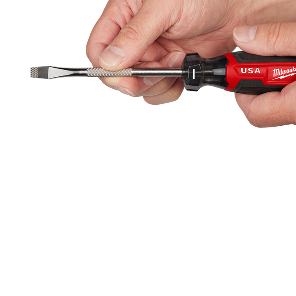 Our Milwaukee® USA Made Cushion Grip Screwdrivers are manufactured to give the professional the best-fitting screwdriver with max grip. Our screwdriver tips are custom machined to deliver a precise fit and reduce stripping during demanding fastening applications. For added confidence, the tips are laser etched to increase the gripping surface. Manufactured with high-strength, boron-infused steel for increased hardness, our screwdrivers stand up to the demands of the site with ultimate durability and life. Providing increased versatility, select screwdrivers include a wrench-ready bolster for added torque and a knurled shank for precision control. Quick identification markings on the handle make it easy to identify screwdriver tip size, including Phillips, slotted, and cabinet tips. Our Milwaukee USA Made Cushion Grip Screwdrivers are made in the USA with cutting-edge manufacturing technology and the highest-quality, USA-sourced materials all backed by a complete Lifetime Guarantee.