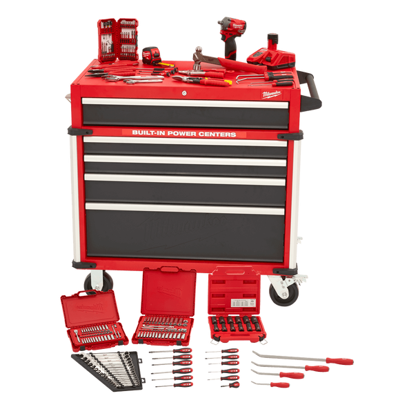 The Milwaukee® 238 Piece Automotive Starter Toolkit is a must-have kit for anyone starting out in the workshop. Your tools will be kept safe and secure in the 36" Steel Top Mobile Work Bench with its reinforced angle iron frame and 6" industrial casters, while its lockable 45kg soft close drawers, built-in power center, cable hooks and dedicated organiser provide you with the smooth accessibility and modern features required for everyday use. Increase jobsite productivity with our M12™ Stubby Impact Wrench, which comes with two battery packs and a charger. The Milwaukee® 238 Piece 36" Automotive Starter Toolkit also comes with a large range of our innovative Impact rated Accesories and automotive Hand Tools, including ratchet and socket sets, wrench sets, screwdrivers, pliers, pry bars, hook and pick sets and more, so you are ready to tackle any challenge that comes your way.