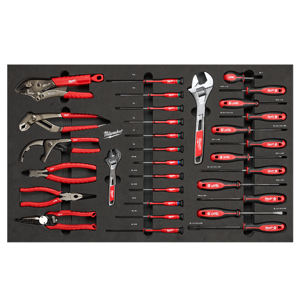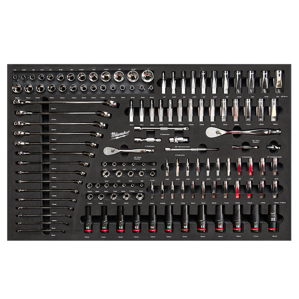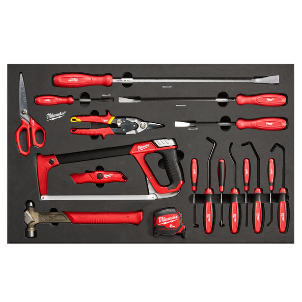 The Milwaukee® 238 Piece Automotive Starter Toolkit is a must-have kit for anyone starting out in the workshop. Your tools will be kept safe and secure in the 46" Steel Top Mobile Work Bench with its reinforced angle iron frame and 6” industrial casters, while its lockable 45kg soft close drawers, built-in power center, cable hooks and dedicated organiser provide you with the smooth accessibility and modern features required for everyday use. Includes two pieces of premium laser cut EVA Drawer Foam, for quick and easy size identification and visibility for missing tools. Increase jobsite productivity with our M12™ Stubby Impact Wrench, which comes with two battery packs and a charger. The Milwaukee® 238 Piece 46" Automotive Starter Toolkit also comes with a large range of our innovative Impact rated Accesories and automotive Hand Tools, including ratchet and socket sets, wrench sets, screwdrivers, pliers, pry bars, hook and pick sets and more, so you are ready to tackle any challenge that comes your way. <br><br> <strong><em>Disclaimer: Tool specifications may occasionally differ where newer model tools are released.</em></strong>