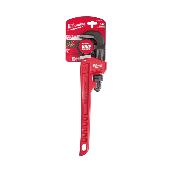 MILWAUKEE 48227114, 355mm (14”) Steel Pipe Wrench has been designed from the ground up to offer maximum productivity to the professional user. The 355mm Steel Pipe Wrench features and overbite jaw design offering the largest gripping surface. Dual coil springs offer maximum durability and tool life, and the ergonomic handle form has been designed for maximum comfort and won’t dig into the palms. Through hardened jaws deliver increased grip and tooth durability, and a tether-ready handle loop makes the MILWAUKEE 48227114 perfect for the toughest of jobsites. MILWAUKEE stands behind their product and offers a Limited Lifetime Warranty with all pipe wrenches.