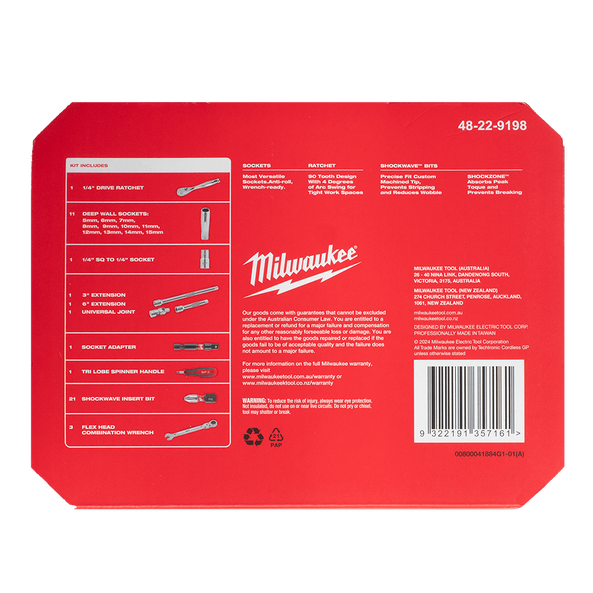 The MILWAUKEE 1/4" Drive 42pc Premium Metric Socket, Bit & Wrench Set is designed offering our users the Most Versatile Sockets that are Anti-Roll and Wrench-Ready. Its innovative FOUR FLAT Sides feature an anti-roll and wrench-ready design. The 90 tooth ratchet tool offers 4° of arc swing and a slim profile design, allowing you to work in tighter and more confined spaces, be it under the hood of a car or in the middle of a remodel. All of our sockets are stamped with metric measurements on the flat side for easy-to-read visibility. It also comes with a durable carrying case for ultimate portability. Our Flex Head Ratcheting Combination Wrenches feature a market leading 2.5° of arc swing, and alongside the flex-head, allows our users to work quickly and efficiently tight spaces.The set comes with accessories included so that our users can get every job done, both in the garage and on the job site.