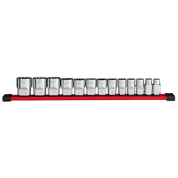 The 13pc 1/2" Drive 12-Point SAE Socket Set with FOUR FLAT™ sides is designed from the ground up to be part of the most versatile socket family. Milwaukee® sockets feature an innovative design with four parallel flat sides, which deter rolling and are wrench compatible. The laser-engraved size markings provide easy identification, and chrome plating offers rust and corrosion protection. This set includes a storage rail for better organization. All Milwaukee® sockets are backed by a Lifetime Guarantee.