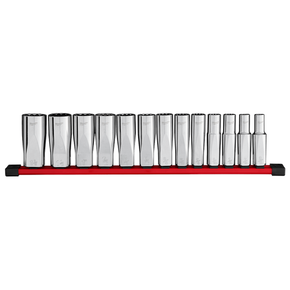 The 13pc 1/2" Drive 12-Point SAE Deep Well Socket Set with FOUR FLAT™ sides is designed from the ground up to be part of the most versatile socket family. Milwaukee® sockets feature an innovative design with four parallel flat sides, which deter rolling and are wrench compatible. The laser-engraved size markings provide easy identification, and chrome plating offers rust and corrosion protection. This set includes a storage rail for better organization. All Milwaukee® sockets are backed by a Lifetime Guarantee.