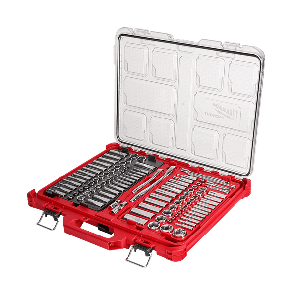 Our 1/4” and 3/8” Drive 106 Piece Metric and SAE Ratchet and Socket Set with PACKOUT™ combines the benefits of the PACKOUT™ modular storage system with our innovative Ratchets and Sockets, designed from the ground up to provide the end-user with ultimate flexibility, robustness and ease-of-use. The 90-tooth ratchet tool offers 4° of arc swing and a slim profile design, allowing easier work in tight areas where space is limited. Our sockets feature FOUR FLAT™ sides, which deter rolling and are wrench-ready for enhanced versatility, while they have optimised socket geometry to reduce bolt rounding and stripping. Our sockets also have their metric measurements stamped into the flats for improved, easy-to-read visibility. The IP65 Rated PACKOUT™ set comes with a removable inner tray offering the user the flexibility to store the set long-term in a steel storage chest, so whether on the move or in the garage, your set will remain both robust and flexible. Our 1/4” and 3/8” Drive 106 Piece Metric and SAE Ratchet and Socket Set with PACKOUT™ is backed by a lifetime guarantee.