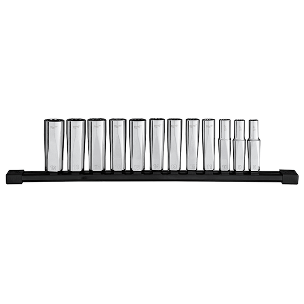 The 12pc 3/8" Drive 12-Point Metric Deep Well Socket Set with FOUR FLAT™ sides is designed from the ground up to be part of the most versatile socket family. Milwaukee® sockets feature an innovative design with four parallel flat sides, which deter rolling and are wrench compatible. The laser-engraved size markings provide easy identification, and chrome plating offers rust and corrosion protection. This set includes a storage rail for better organization. All Milwaukee® sockets are backed by a Lifetime Guarantee.