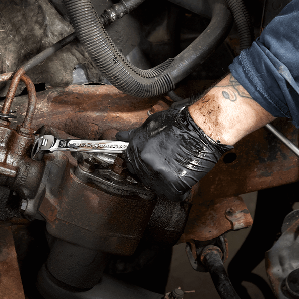 Our Flex Head Ratcheting Combination Wrenches feature a market leading 2.5° of arc swing, and alongside the flex-head, allows our users to work quickly and efficiently tight spaces. With durable double-stacked pawls in the ratcheting mechanism we offer a long ratchet life and improved access with 144 ratcheting positions. MAX BITE Open-End Grip improves the ratchet wrench's grip on nuts and bolts, offering 25% more torque than smoth-faced wrenches and preventing rounding of the fastnener. Each combination wrench features a comfortable I-Beam handle design for improved ergonomics. Our ratcheting combination wrench set features ink-filled size labels for easy size identification, as well as quick distiction between SAE and metric sets. We stand behind our products, offering a Lifetime Guarantee on all of our combination ratchet wrench sets.