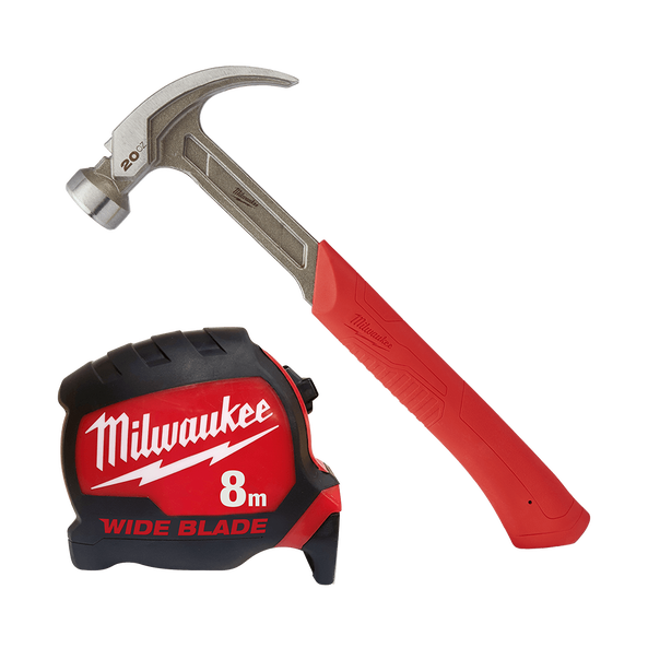 The Milwaukee 20oz Curved Claw Hammers provide incredible driving performance. Featuring Milwaukee's ShockSheild Grip for reduced vibration and increased durability, I-beam handle and precision balanced for maximum comfort. Also features a magnetic nail set for starting nails plus a curved claw for pulling nails. The Milwaukee Wide Blade Tape Measures have the longest, straightest standout in the industry giving you up to 4.2m of standout for extended reach and efficiency on the jobsite. The straight standout is highly usable and makes it easier to measure long distances alone. The tape measures are wear and impact-resistant with nylon bond blade protection and an additional anti-tear coating on the first 152mm (6”) of the blade, reducing tape tear. Built to withstand the jobsite, the measuring tapes are constructed with a 5-point reinforced frame for impact resistance.