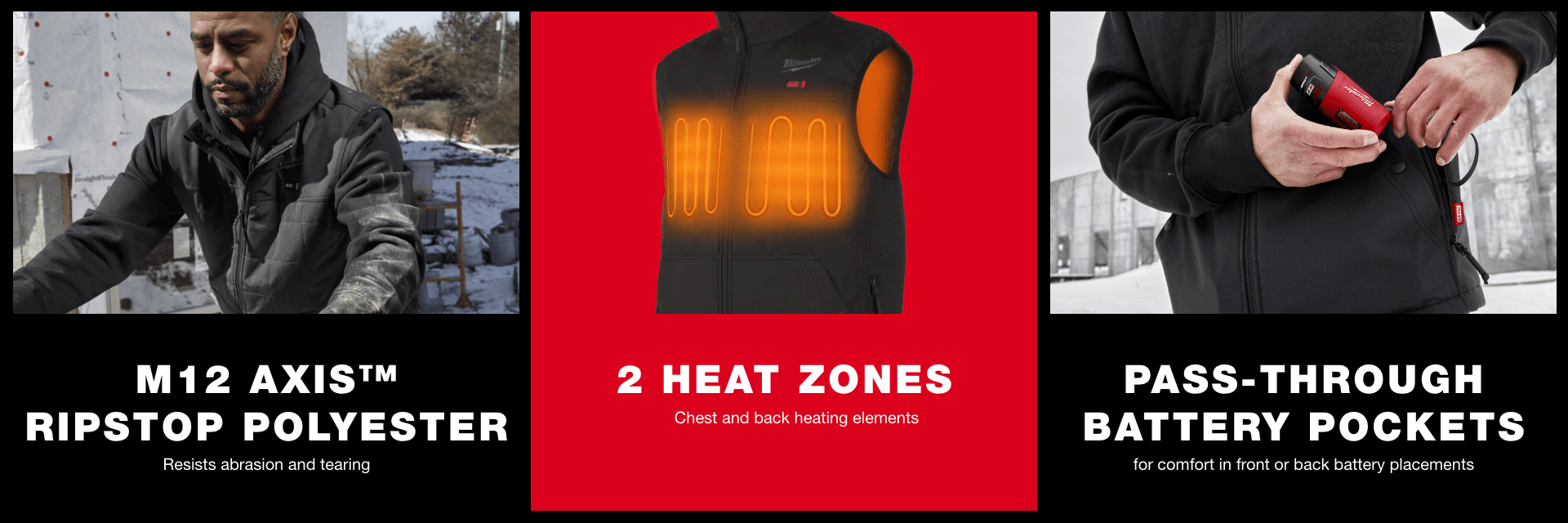 The M12™ Heated AXIS™ Vest delivers heat built for lightweight durability. Powered by M12™ REDLITHIUM™ Battery Technology, this stylish vest features an advanced heat technology system utilizing carbon fiber heating elements to create and distribute heat to the chest and back. A single touch LED controller heats up the battery heated jacket to three heat settings, creating a comfortable heat for any environment. A hidden battery pass-through pocket construction allows for front or back battery placement, increasing comfort and versatility depending on the situation. With re-engineered AXIS™ Ripstop polyester fabric, the MILWAUKEE® vest protects users from abrasion and prevents tears from spreading in harsh jobsite conditions.