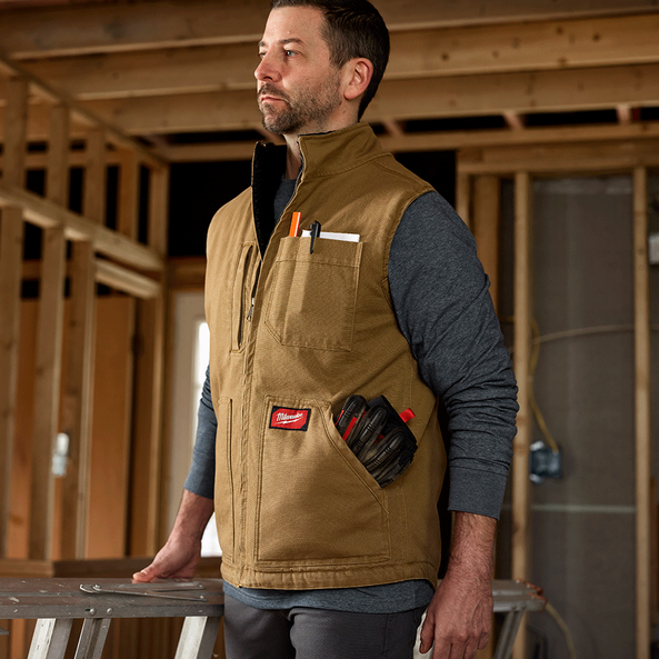 The GRIDIRON Sherpa Lined Vest offers a durable and functional solution that keeps users moving on the jobsite. With its warm and comfortable Sherpa-lining, this Heavy Duty tool vest delivers reinforced high wear zones including durable front pocket construction and under-arm stitching. The 5-pocket design allows for easy access and numerous options for tool storage. Choose from Black or Brown colours, available in sizes small to 2XL.