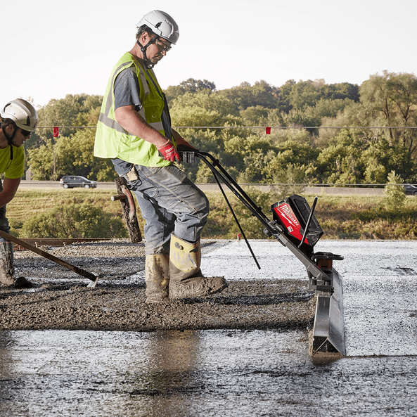 MX FUEL™, Milwaukee®'s new equipment system, goes beyond the limitations of petrol and corded units, utilising the industry's most advanced batteries, motors, and electronics to deliver the best experience for users. This is equipment, redefined. The MX FUEL™ Powered Screed Concrete provides consistent starts and reliable pours with the power to pull bars from 1.2m (4 ft) up to 4.8m (16 ft), no petrol headaches, and runtime on up to 2 hours / 929m² on 1 MXFCP203 battery, with 3.6m (12 ft) bar and with partial throttle. The POWERSTATE™ Brushless Motor delivers the power to pull 4.8m (16 ft) bar at 9,000 VPM with a variable speed trigger, giving users control in stiff and wet concrete, and having the power to consolidate up to 152mm (6") thick concrete. The MX FUEL™ REDLITHIUM™ battery pack provides instant power with no petrol headaches and requires no regular maintenance, for a safer workspace, indoors or outdoors. The push-button start delivers instant power, eliminating the repetitive motions of a pull start and reducing downtime, allowing users to get jobs done fast without sacrificing the power and runtime users expect. The MX FUEL™ Powered Screed Concrete can accept bars up to 4.8m (16 ft) long without sacrificing power and can run two motors on one bar for increased mobility. Designed for indoor and outdoor use, the MX FUEL™ Powered Screed Concrete is IP55 rated for dust and water resistance. REDLINK PLUS™ Intelligence ensures optimal performance and provides overload protection to protect the machine and battery during tough applications. It is compatible with all MILWAUKEE® MX FUEL™ REDLITHIUM™ batteries, giving users a hardworking and reliable power for equipment. The MX FUEL™ Powered Screed Concrete is ONE-KEY™ compatible, allowing users to track, manage and secure the machine.