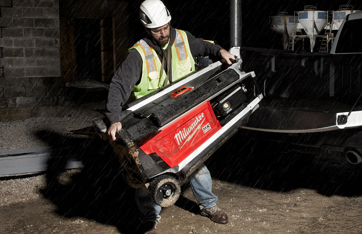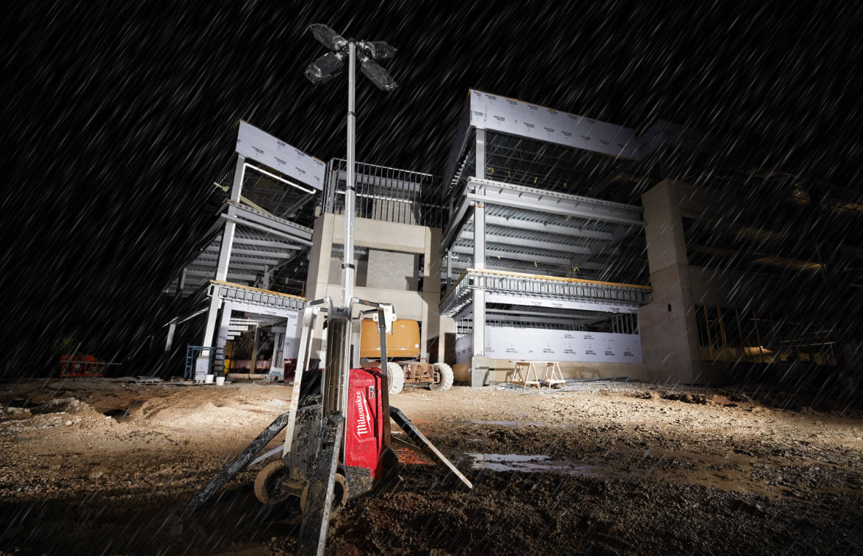 MX FUEL™, Milwaukee®'s new equipment system, goes beyond the limitations of petrol and corded units, utilising the industry's most advanced batteries, motors, and electronics to deliver the best experience for users. This is equipment, redefined. The MX FUEL™ Tower Light/Charger is the new way to light the site. The portable 3 m light is designed for both indoor and outdoor use. The Tower Light provides up to 27,000 lumens of task and area lighting and withstands harsh jobsite environments. The portable Tower Light provides users with an easily portable, high output cordless light well-suited to remote applications and early phase construction. The 8” (203 mm) all-terrain wheels ensure users can easily roll the work light across uneven jobsites, whether it needs to be moved across rough terrain during early phase construction or across pan decking for early morning concrete pours. The Tower Light/Charger can be set up in seconds with a motorised mast that extends to a maximum height of 3 m and collapses back down to 1.2 m for easy transportation and storage. Once it is in place, 4 outriggers can quickly be deployed to provide more stability on uneven surfaces. The four multidirectional LED light heads give users the ability to cast up to 27,000 lumens of TRUEVIEW™ High Definition Output in several directions. When powered by our MX FUEL™ REDLITHIUM™ XC406 battery pack, the Tower Light/Charger runs for up to 10 hours on a single charge. It can also be plugged into an extension cord for all-day operation as well as charge any MX FUEL™ REDLITHIUM™ battery packs. It is compatible with all MILWAUKEE® MX FUEL™ REDLITHIUM™ batteries, giving users a hardworking and reliable power for equipment. The MX FUEL™ Tower Light/Charger is ONE-KEY™ compatible, allowing users to track, manage and secure the machine.