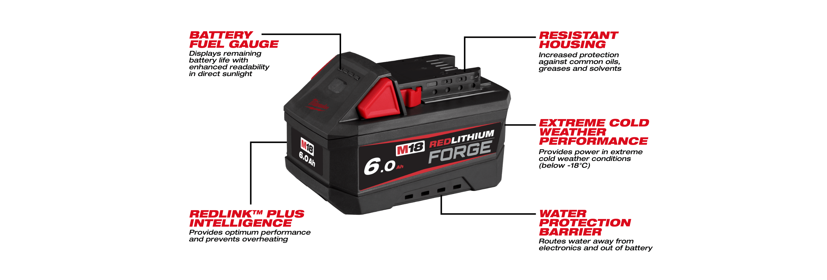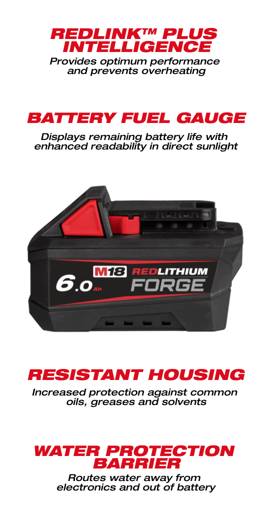 The M18™ REDLITHIUM™ FORGE™ 6.0Ah Battery delivers high power in a smaller, more ergonomic size and the longest life vs REDLITHIUM™ batteries. REDLITHIUM™ FORGE™ are Milwaukee’s most powerful, fastest charging, and longest-life batteries. The optimised combination of size, weight, and increased power provides the best solution for power-demanding overhead work and tight work areas. When paired with the M18™ Dual Bay Super Charger, The REDLITHIUM™ FORGE™ 6.0Ah is the fastest charging battery pack within its class on M18™, charging in just 15 minutes to 80% and 25 minutes to 100%. The M18FB6 has the longest life, the most recharges, and the best performance over the life of the battery. This solution is designed with resistant housing for increased protection against exposure to common oils, greases, and solvents. Built-in REDLINK™ PLUS Intelligence protects the battery from overloads, preventing you from damaging your cordless power tools in heavy-duty situations. The REDLITHIUM™ FORGE™ 6.0Ah battery is fully compatible with 250+ M18™ solutions.