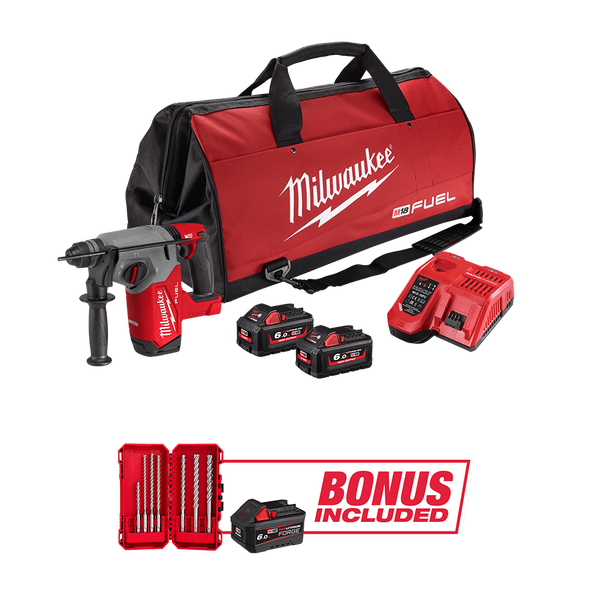The M18 FUEL™ 26mm SDS Plus Rotary Hammer delivers fast drilling, hard-hitting performance and maximum control for productivity on the jobsite. Designed to achieve top performance with only moderate pressure, the rotary hammer is compatible with all M18™ REDLITHIUM™ batteries and is optimised for use with M18™ REDLITHIUM™ HIGH OUTPUT™ 6.0Ah batteries (sold separately). The POWERSTATE™ Brushless Motor delivers users 2.7 J of impact energy, 1,330 RPM, and 4,800 BPM, providing speed and power in the most demanding applications. REDLINK™ PLUS Intelligence tool technology ensures maximum rotary drill performance and protects the tool from overload, overheating, and over-discharge. The MILWAUKEE® M18 FUEL™ 26mm SDS Plus Rotary Hammer includes AUTOSTOP™ Kickback Control for maximum control and enhanced safety, with the tool sensing a bind-up situation when users are drilling in rebar or hard aggregate and stopping over-rotation, without the need for the user to release the trigger, indicated by the AUTOSTOP™ Indicator LED. The Anti-Vibration System (AVS) minimises vibration for maximum comfort when in use for extended periods. A Dedicated Dust Extractor (M18FDEX) is also available (sold separately), which once connected is powered by the Rotary Hammer.
