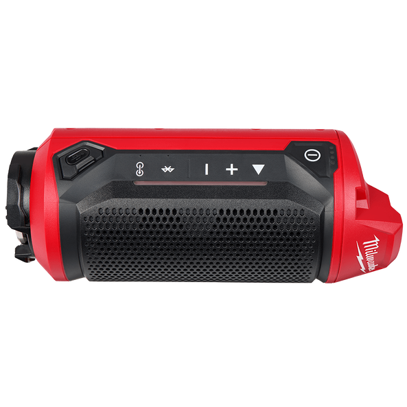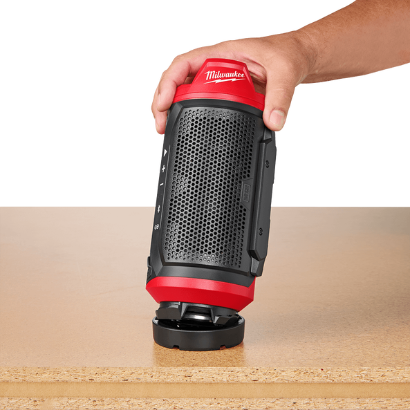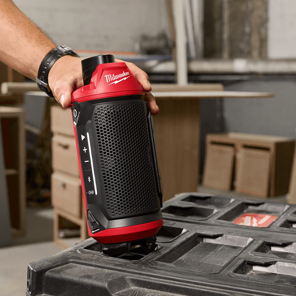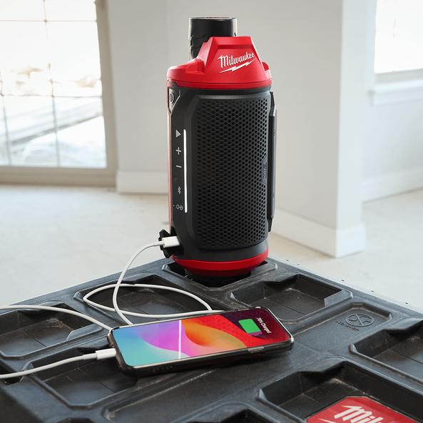 The M12™ Bluetooth® Jobsite Speaker delivers a CLEAR SOUND experience and JOBSITE VERSATILITY. The 3.5” woofer and high frequency tweeter deliver optimised sound for small to medium sized spaces. Bluetooth® 5.3 provides up to 60 metres of range to keep you connected throughout the jobsite. AUDIO-LINK allows you to play music through multiple speakers by wirelessly daisy-chaining over 200 Milwaukee AUDIO-LINK compatible devices, creating a larger sound experience. The M12™ Bluetooth® Jobsite Speaker provides up to 10 hours of run-time at 100% volume on the M12™ REDLITHIUM™ 4.0Ah battery (M12B4), is PACKOUT™ compatible and comes with a PACKOUT™ Twist-To-Lock Mount and Screws so you can secure the unit as you choose. The built-in equaliser settings allow you to customise the bass and treble to your preferred sound and you can charge up personal devices wherever you go with USB-C 3.0A device charging. Water, dust, and impact resistant, the speaker withstands the most demanding jobsite environments and provides FLEXIBILITY with various listening orientations and hanging options, including an integrated d-hook and nail hook.