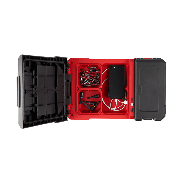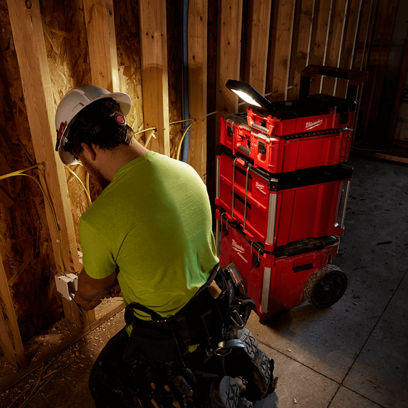 The M12™ PACKOUT™ Area Light provides maximum output in a compact and easy to transport design. Our compact and portable flood light delivers 1,400 lumens of TRUEVIEW™ high definition output and is top stack compatible with our PACKOUT™ Modular Storage System. The light head can rotate 300 degrees horizontally and 180 degrees vertically for complete light head control. With three different modes (high, medium, low), output and runtime can be adjusted depending on the job, with up to 17 hours of runtime on a M12B6. Also included in this light is built-in storage with two storage containers to optimise space and organisation. The PACKOUT™ Light allows you to charge devices with the 2.1AMP USB-A and USB-C ports whiles storing small items inside the storage compartment. Built to withstand the toughest conditions this light is IP54, drop-rated, and covered with a 5-year tool and limited LED warranty.