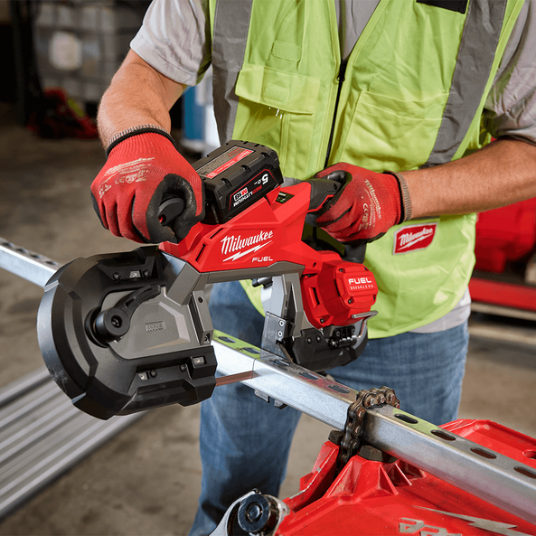 The M18 FUEL™ 125mm kg, Deep Cut Band Saw delivers user-demanded performance with the ability to cut fast. Weighing only 4.8kg, the M18FBS1250 reduced weight means less user fatigue and easier adjustments for overhead cutting. Milwaukee's cordless Deep Cut Band Saw provides users with up to 78 cuts per charge in 41 mm uni-strut with an M18 REDLITHIUM™ 5.0Ah Battery, eliminating multiple trips to the charger onsite. The POWERSTATE™ brushless motor delivers maximum power and 167.6 SMPM to remove material faster and increase productivity. With Variable Speed Mode Select, and a feathering trigger to allow for control over the speed of cut on thicker metals. A tool-free adjustable shoe, to help guide the user through a straighter cut, and an LED Work light to illuminate their application means faster more accurate cutting with minimised adjustments. the M18 FUEL™ 125mm Deep Cut Band Saw is equipped with features to enhance the control of users cuts while maximising the cutting experience safely throughout the day.