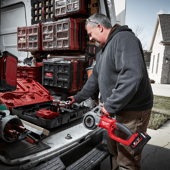 The M18 FUEL™ Compact Pipe Threader w/ ONE-KEY™ gives you the power to thread up to 1-1/4” (32mm) stainless steel, rigid metal conduit (RMC), black iron pipe and more. The compact pipe threader offers the industry’s most controlled threading experience, featuring AUTOSTOP™ technology that senses severe kickback and automatically shuts off the tool. Our compact threader features a locking die head interface to prevent die head ejection and side grip to eliminate the need to contact the spinning die head when starting threads. Compatible with our ONE-KEY™ Technology that wirelessly connects to a smartphone to track the tool's location, manage it in inventory, and lock the tool out for added security and protection to your investment